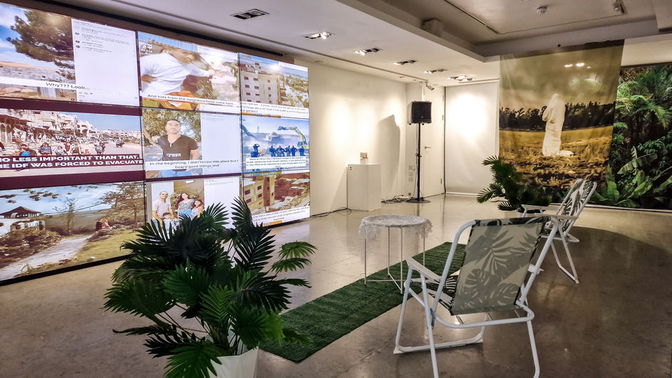 A Villa in the Jungle & Other Stories A pop-up exhibition at Collective Space shop in Brighton & Hove, UK 56 Church Rd, Brighton and Hove, Hove BN3 2FP January 11th - February 6th 2025 Instagram [from January 10th] https://www.instagram.com/a_villa_in_the_jungle/ From its offices in Brighton & Hove, UK, a Villa in the Jungle real estate Agency sells houses on Gaza’s beach. The adverts for the sale show these houses on pristine dunes facing the sea, just off the bombed and demolished neighbourhoods and refugee camps. You cannot smell the dead bodies that are buried under those ruins. If you finish reading the project description on the office window [or its website] without throwing up, you will be shown an introductory film portraying your new life there. The film collage was created from “testimonies” of settlers in their latest big houses in the Occupied West Bank taken from an Israeli real-estate developer company, Harey Zahav, which specialises in building in the West Bank and, since the invasion of Gaza, has been promoting new settlements there as well. The company's Instagram features cheerful Jewish mothers showing us around their “too big kitchens,” large garages/gaming rooms, and great outdoor spaces for the kids. These economic-colonialist Jews move there because of the rising prices of homes in Israel and the lower prices of houses in the occupied West Bank, partly because of government indirect subsidies, making up about 60% of the Jewish settlers. In comparison, the ideologist settlers account for about 40%. While they are portraying the significant advantages of living there, the film cuts into segments of the lives of Palestinians living outside the settlement walls. Halfway into the film, a Jewish mum takes us around their beautiful big garden, followed by another mum from another place and time, who just wanted a house in the countryside - the later scene is taken from Jonathan Glazer’s “Zone of Interest” and in the background is not the separation wall but Auschwitz’s fences. Like Glazer’s film, which chillingly manifests Hannah Arendt’s “Banality of Evil”, the installation film “Living the Dream” does the same thing by juxtaposing the delightful life of the settlers with the daily atrocities committed against Palestinians. Villa in the Jungle, the installation’s name, is based on depictions of Israel as a beacon of civility, modernity, and westward facing in the backward, if not primitive, Middle East. This colonial, if not White supremacist imagery, has been part of Zionism from its early days to today. The one who popularised this particular expression was Ehud Barak, the former Israel prime minister [1999-2001] from a Central-Left party, but Benjamin Netanyahu and others have used it as well. The fake estate agency's window front is identical to that of a typical real estate agency. The interior design of the shop, where the film is shown on a TV screen, embodies colonial imagery: jungle-themed picnic chairs, an oriental coffee table covered with European lace, and a 50s modernist standing lamp. Exiting the real estate office, visitors can purchase a postcard with their dream home, with proceeds going to the Gaza organisation We Are Not Numbers. The Village In The Jungle—A-state Agents was created by the British / Israeli award-winning artist Gil Mualem-Doron as part of a larger project that will be shown in London in 2025. Mualem-Doron’s work has been shown in places such as Tate Modern, Turner Contemporary, and the South Bank Centre. He has had solo exhibitions at the People’s History Museum, Worthing Museum, P21 Gallery, and Rich Mix in the UK and in museums and galleries in Brazil, Germany, Israel-Palestine, Norway, and South Africa. The exhibition A Villa In The Jungle & Other Stories will include three more parts: A photography exhibition of local pro-Palestinian protests in Brighton & Hove, including photos from Brighton Pride Queer for Palestine intervention and Na’amod actions. Na’amod is a movement of Jews in the UK seeking to end our community’s support for Israel's occupation and apartheid, and to mobilise it in the struggle for freedom, equality and justice for all Palestinians and Israelis: www.Naamod.org.uk The Know Their Names project - about eight thousand ribbons with the names and ages of children who were killed in Gaza since October 7th. The ribbons used in processions and demonstrations in Brighton will be shown as part of a room installation. We Art Not Numbers [WANN] works from the Gazan group formed in 2014. Through powerful storytelling, WANN inspires positive political and social change, advancing the Palestinian quest for self-determination, human rights, justice, and peace. WANN empowers emerging Palestinian writers to bring the people and places behind news statistics to life, humanising the Palestinian experience. WANN provides the world with direct access to Palestinian narratives without restriction and without foreign intermediaries speaking on their behalf. It amplifies the Palestinian perspective that historically has been suppressed in the mainstream media. To learn more about WANN work, please visit: https://wearenotnumbers.org/ The exhibition is produced by Molly Stone and supported by the Na'aamod [Brighton], Brighton Trust and Unison.